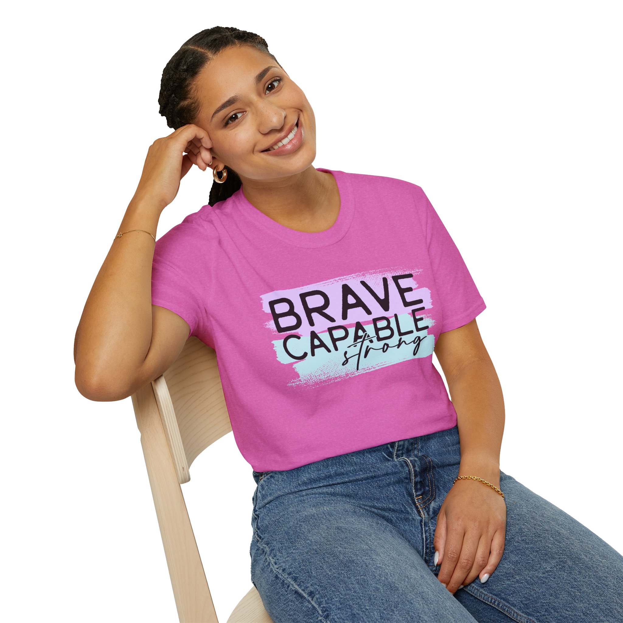 Show your strength and confidence with this Brave, Capable, Strong t-shirt featuring bold black lettering over pastel lavender and aqua brushstrokes. This inspirational graphic tee is perfect for women who love daily reminders of empowerment, motivation, and positivity.