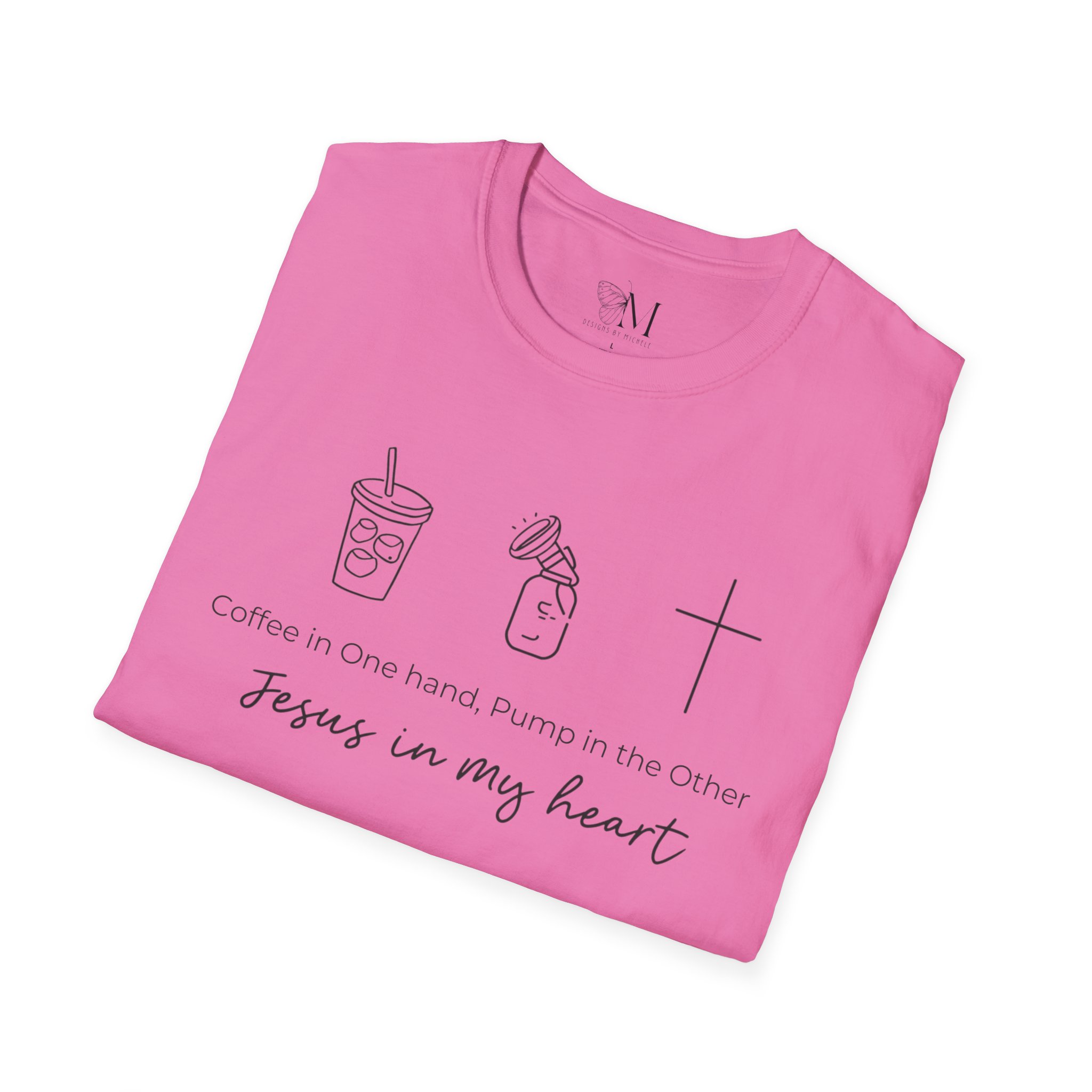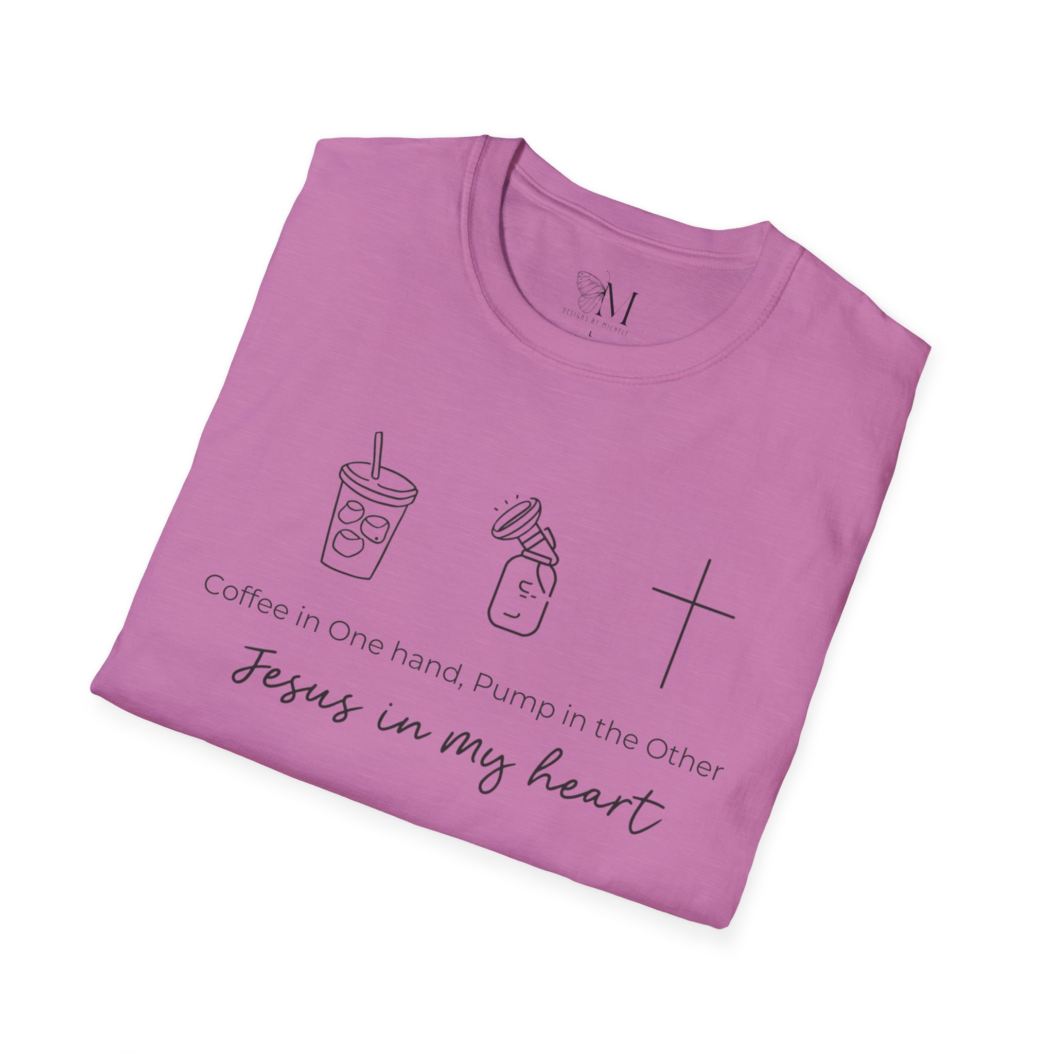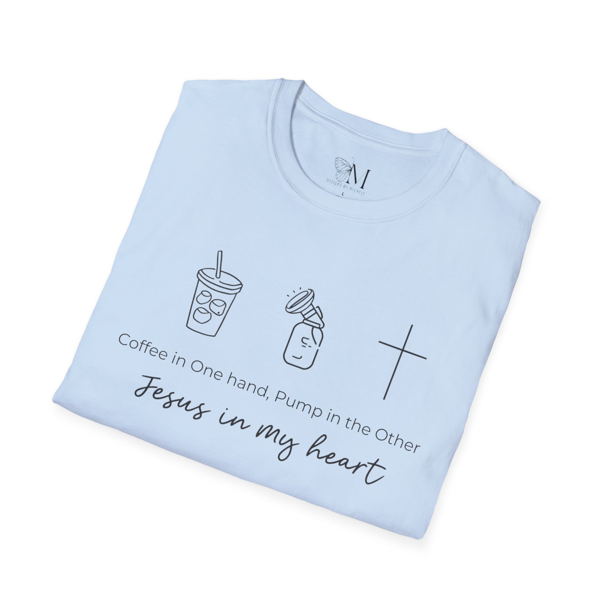 This cozy graphic tee features three minimalist doodle-style icons across the chest — an iced coffee, a breast pump, and a simple cross — paired with the heartfelt phrase “Coffee in One Hand, Pump in the Other, Jesus in My Heart.”